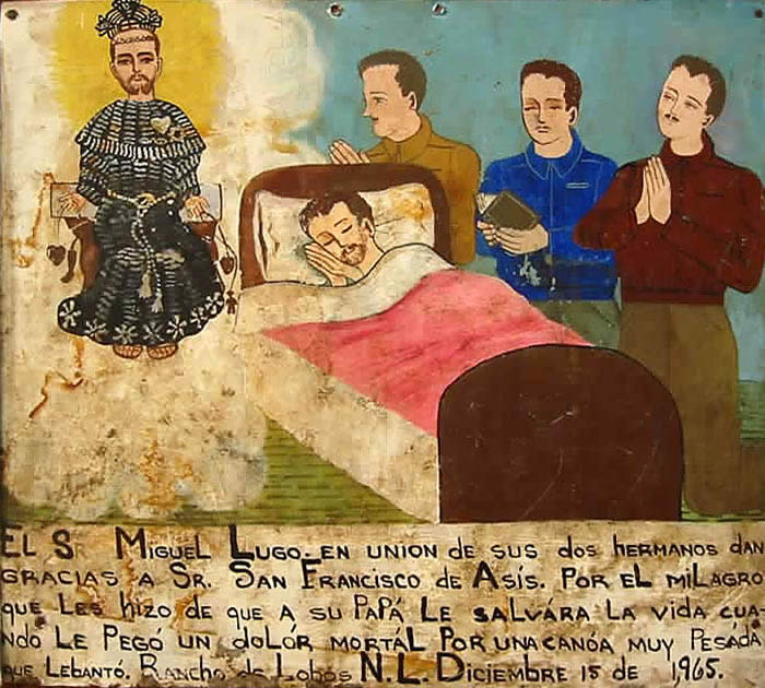 While the Spanish ex-votos use only a pictorial representation to give thanks for a specific favor, in Mexico this is accompanied by a brief, simple, anecdotal legend at the foot of the image, describing the miracle granted. The ex-votos were entrusted to artisans in small regional workshops. These artisans were for the most part anonimous artists with little or no technical knowledge or learning.